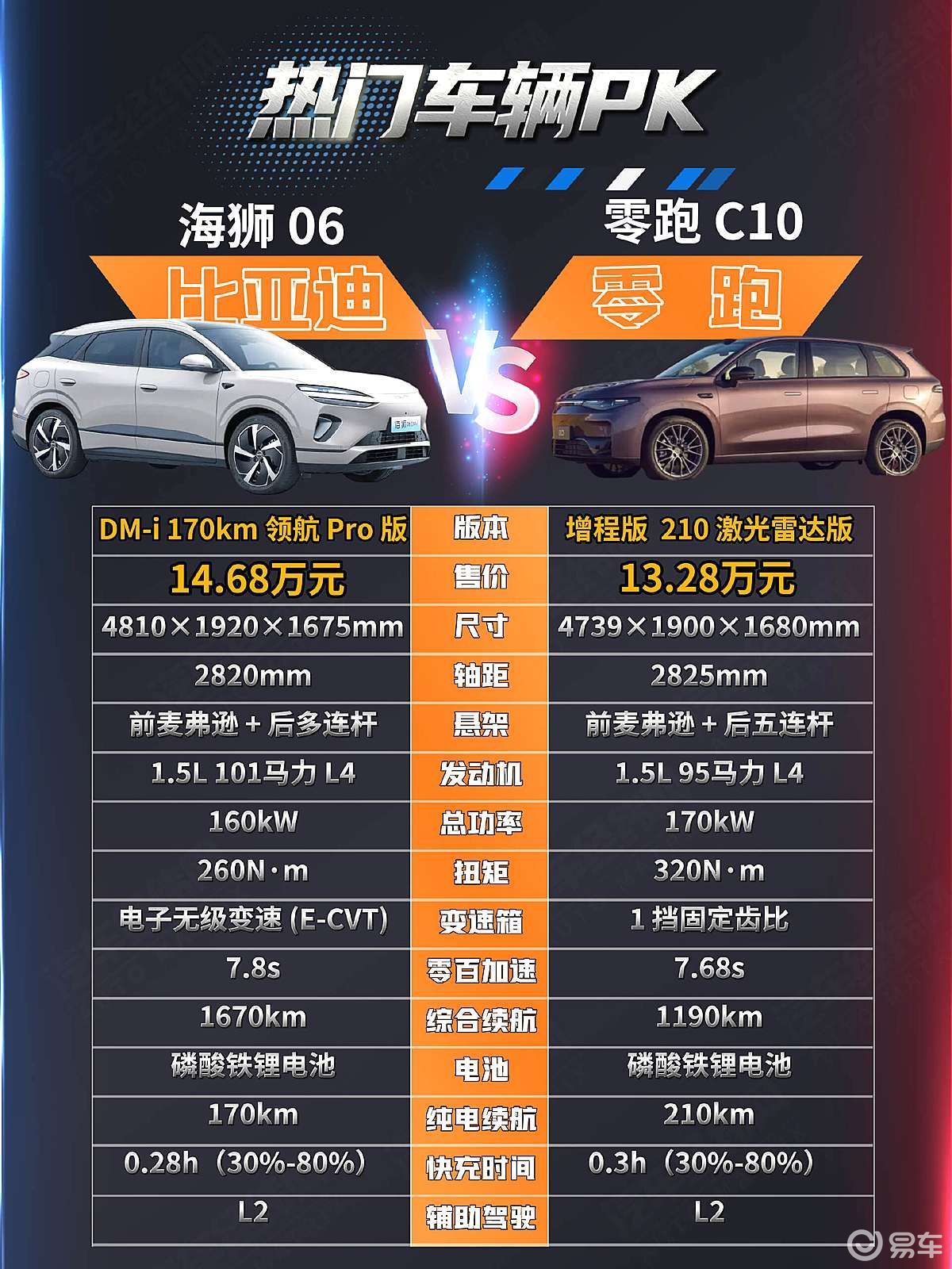 我们选取售价14.28万元的比亚迪海狮06 2025款 DM-i 1.5L 170km领航Pro版,与售价在13.28万元的零跑C10 2026款增程210激光雷达版进行对比,看看谁更能满足你对“底价高配”的核心诉求。