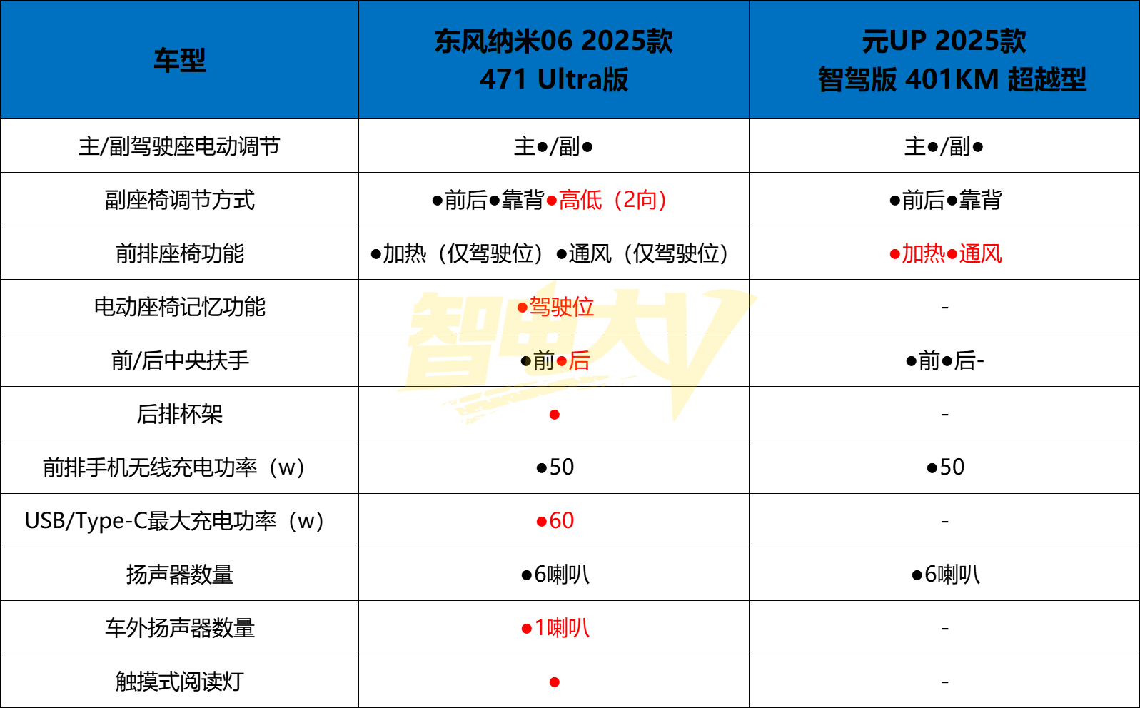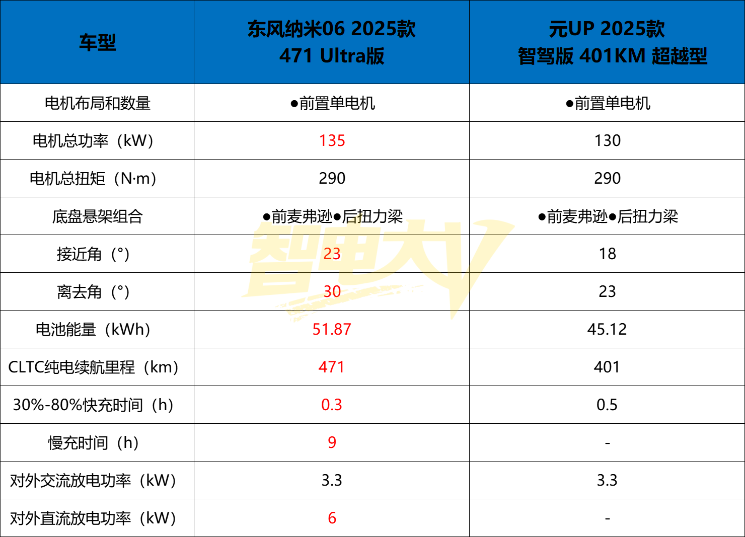今天小弟就从年轻人买车比较关注的几个维度,来比较一下这两款车。为了让本次对比更有针对性和公平性,分别选择了东风纳米06 471 Ultra版(终端价格10.99万 以下简称东风纳米06)和比亚迪元UP 智驾版 401KM 超越型( 终端优惠价10.98万 以下简称元UP),看看到底谁更值得购买。