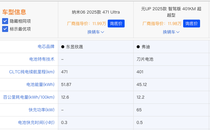 那此次对比的两款车型呢,分别是东风纳米06 471Ultra版和元UP智驾版 401km超越型,也都算是各自车型里面的顶配车型了,所以理论上来说,我们日常所需要的舒适配置和智能配置两款车型都具备。但是怎奈车市这么卷,你有的我必须有,你没有的我还要有,因此在基础的配置之余,二者在细节处做了哪些优化调整才是我们关注的重点。