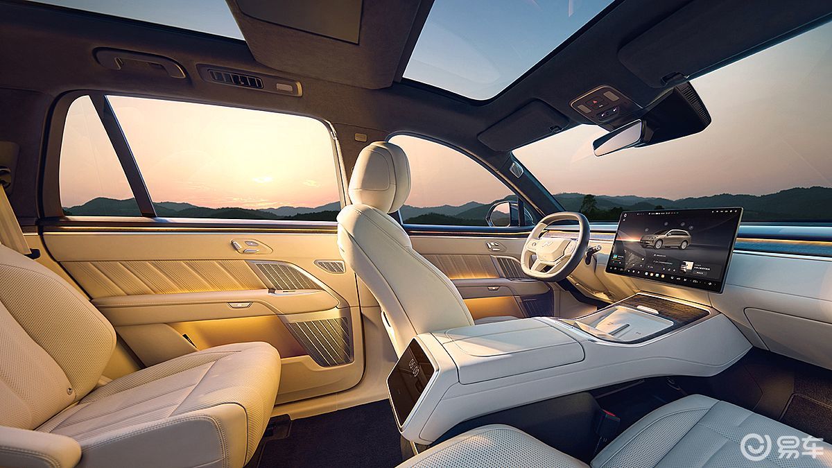 车内标配静音电吸门、双层隔音玻璃和车载香氛系统,配合后排独立空调触控屏,舒适性表现突出。