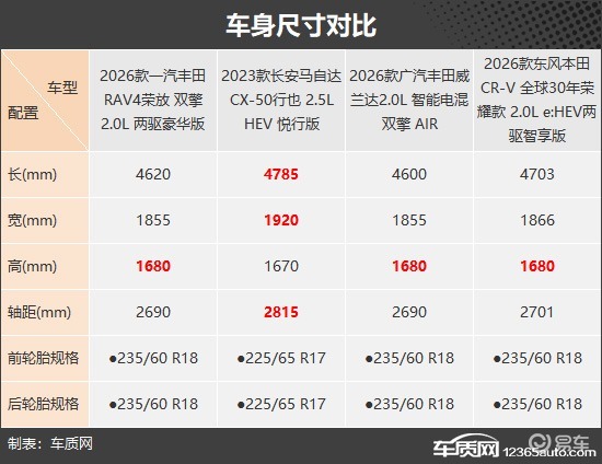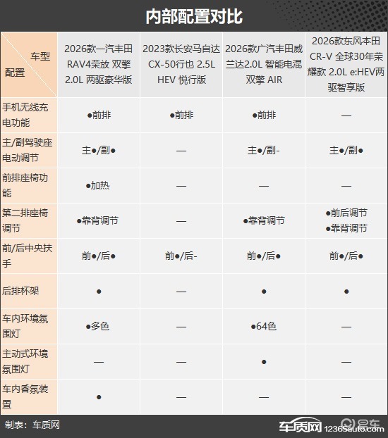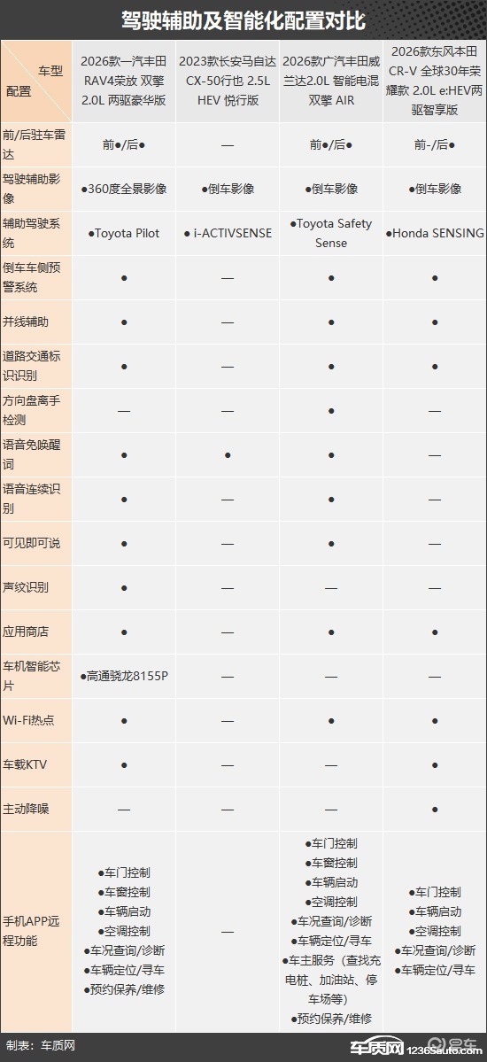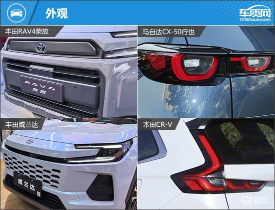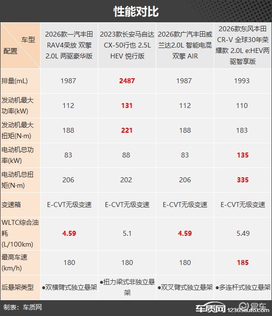 本次挑选的四款车型分别为2026款一汽丰田RAV4荣放 双擎 2.0L 两驱豪华版(以下称:丰田RAV4荣放)、2023款长安马自达CX-50行也 2.5L HEV 悦行版(以下称:马自达CX-50行也)、2026款广汽丰田威兰达2.0L 智能电混双擎 AIR(以下称:丰田威兰达)和2026款东风本田CR-V 全球30年荣耀款 2.0L e:HEV两驱智享版(以下称:本田CR-V)。四款车型的产品特点和市场定位基本相同,虽然厂家指导价有一定差距,但因为终端优惠较大,实际售价都很有竞争力(由于目前图片数量较少,因此部分车型的图片并不是相对应的具体款型)。