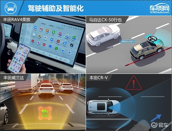 驾驶辅助配置方面,丰田RAV4荣放在驾驶硬件方面表现更好,独享360度全景影像,更方便驾驶者了解车辆周围情况,马自达CX-50行也表现一般,是四款车型中唯一未配备后驻车雷达的车型,对于新手不太友好。辅助驾驶功能方面,丰田威兰达独享方向盘离手检测,并具备并线辅助、倒车车侧预警系统等功能。相比之下,马自达CX-50行也在这一环节依然表现不佳,与另外三款车型存在一定差距。