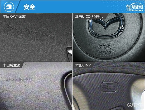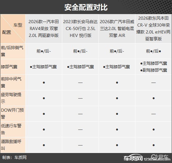 安全配置方面,本田CR-V在被动安全配置方面的表现要优于另外三款车型,独享后排侧气囊和副驾膝部气囊。主动安全配置方面,两款丰田SUV的整体表现更好。相比之下,马自达CX-50行也在这一环节表现不佳,缺失多项配置。