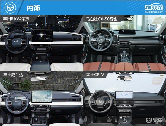 内饰方面,四款车型都采用传统式设计。丰田RAV4荣放和丰田威兰达根据国内消费者的需求特点进行了调整,布局更为简洁。马自达CX-50行也延续了海外版车型的设计,非常注重机械感的营造,这是很多目标客户喜欢的设计。小尺寸中控屏虽然缺乏科技感,但好处是可以减少对视线造成遮挡。本田CR-V采用品牌最新的家族化风格,蜂窝状贯穿式空调出风口、悬浮式中控屏和多功能三辐式方向盘,也同样出现在其他本田品牌车型上。