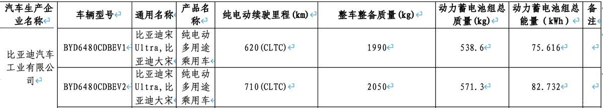 比亚迪多款新车续航曝光 宋Ultra续航710km