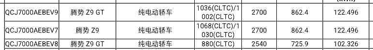 新款腾势Z9此次申报的是单电机版,搭载370kW电机,匹配102.326kWh电池,续航里程为905km,另外还提供122.496kWh电池,续航里程为1068km、1030km。新款腾势Z9 GT匹配122.496kWh电池,续航里程为860km、820km、1036km、1002km;匹配102.326kWh电池,续航里程为880km。