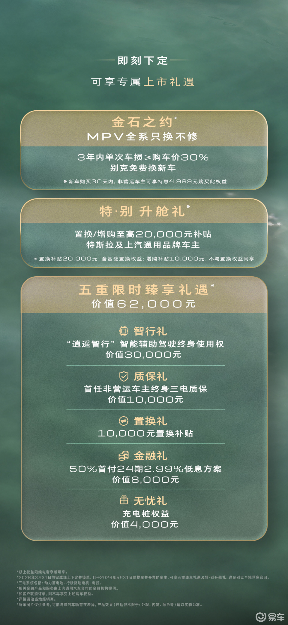 最值得一提的是其“金石之约”保障:至境世家纯电版3年内,若单次事故车损超过购车发票价30%,无需修旧车,直接更换新车!这一承诺打破行业常规,彰显别克对产品品质的绝对自信,也为用户带来前所未有的用车保障,真正实现“购车无压力,用车无顾虑”。