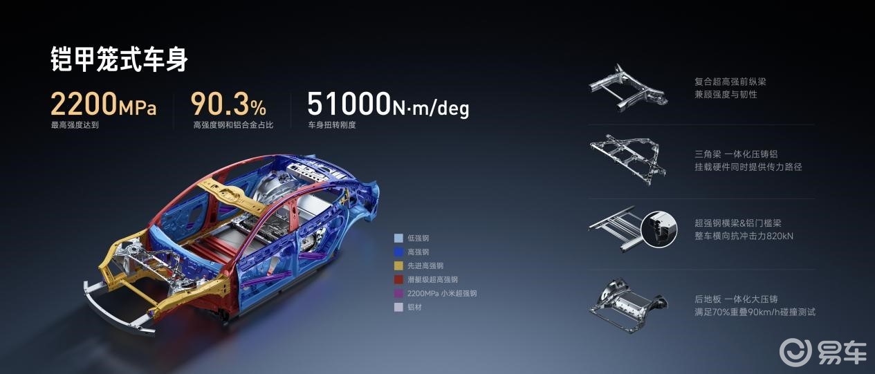 安全层面,新一代SU7以超越行业标准的配置,筑牢全场景安全屏障。整车延续C-NCAP五星、C-IASI G+标准,全系标配2200MPa小米超强钢,高强度钢与铝合金占比达90.3%,车身扭转刚度51000N-m/deg。电池包实现全方位防护,标配1500MPa防刮底横梁与防弹涂层,热失控防护远超新国标,55℃满电状态下单电芯热失控不扩散、不起火、不爆炸,还配备ASIL-D等级电池系统,4ms紧急断电+24小时车云协同预警,守护电池安全。