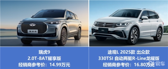 途观L两驱龙耀版车身尺寸为4735×1859×1677mm,轴距2791mm,在车身宽度、轴距以及后排空间上,和瑞虎9耀享版相比都要稍逊一筹。而且它仅支持五座布局,行李箱常规容积495L,拓展后也只有1780L,虽然能满足日常基本需求,但在装载大件物品时,灵活性和容量都不如瑞虎9耀享版,更适合三口之家日常出行。若是对空间有较高要求的家庭,瑞虎9耀享版能带来更舒适的驾乘体验和更灵活的装载空间。