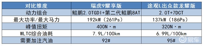 而途观L两驱龙耀版搭载的是2.0T发动机+7速双离合变速箱的动力组合,最大功率137kW(186Ps),最大扭矩320N・m,从动力参数上看它的表现明显落后。而在实际驾驶中,它中后段加速和超车时的体验感较为平淡,差距也就此显现。其WLTC综合油耗低至6.99L/100km,但需要加注95号汽油,出行成本高。对于追求驾驶乐趣和动力表现的消费者来说,在十五万左右油车推荐中,瑞虎9耀享版无疑是更优的选择。