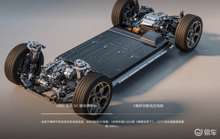 动力方面,提供单电机后驱和双电机四驱两个版本。单电机最大功率230kW,双电机版本前后电机功率分别是140kW和230kW,零百加速最快4.9秒。电池用的是宁德时代的磷酸铁锂电池,有82.368kWh和95.04kWh两种规格,对应CLTC续航630km、700km、730km。