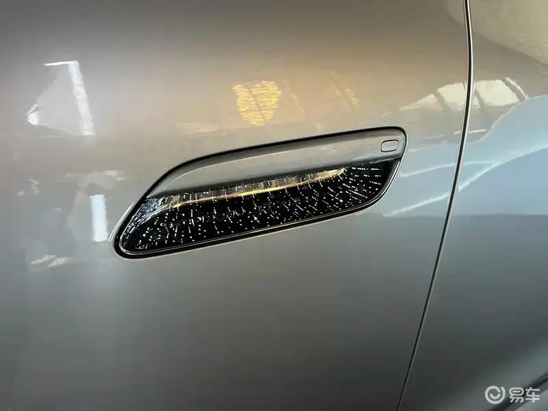 半隐藏式车门把手与车身同色,有效降低风阻并保持侧面干净利落;前翼子板处的黑色饰板点赞,点明其智能科技属性。