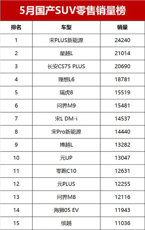 5月国产SUV零售销量榜!宋PLUS卫冕,星越L亚军,问界M8超1.2万辆