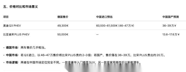 当然,有人会说,奥迪Q3要是国产就好了。是的,如果国产,成本可以砍一大截。我们看现在国产燃油Q3的售价在28–33万之间,换成插混版本,如果保持奥迪一贯的定价策略,大概率落在36–39万的区间。便宜是便宜点,但和宋PLUS这类主流插混SUV相比,依然是贵出两个档位。
