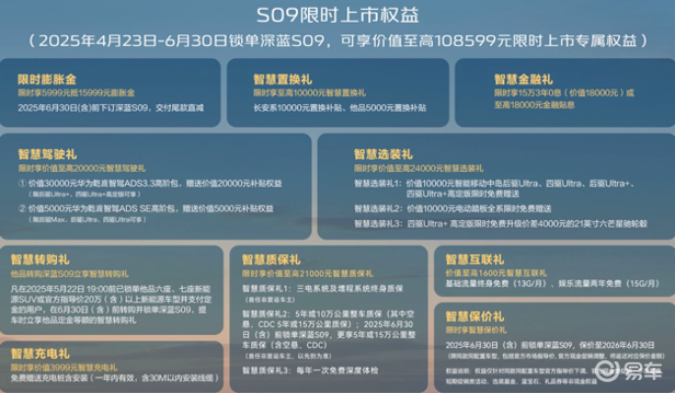 在购车权益方面,目前问界M8提供了首年3000元的免费充电额度、4000元的智驾无忧权益以及在金融贷款方面的一些政策。而深蓝S09在6月30日前下订还提供5999元抵15999元膨胀金,也就是优惠10000元的限时活动,让购车门槛再进一步的降低,此外还有5000-10000元的置换补贴、15万3年0息的金融政策、Ultra+版免费赠送价值20000元的高阶智驾包、ADS SE高阶包(也就是智驾功能免费送),并且Ultra、Ultra+版免费赠送可移动中岛、电动踏板以及21英寸轮毂等价值24000元的选装礼包。此外还有整车三电系统及增程系统终身质保、空悬+CDC悬挂5年或15万公里质保、每年免费深度体检以及赠送充电桩等等等的上市权益,在这个6月下单相当的给力。