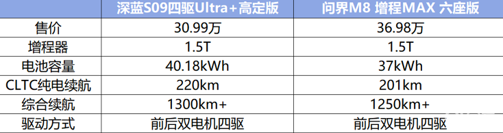 那么真实的情况如何?今天一起来深入对比分析一下。首先看看基本情况,深蓝S09与问界M8相比,除了有四驱的版本,还有更为经济实惠的后驱版本,入门门槛自然要比问界M8要更低。大家可以按需选择。而问界M8也因为起步就是前后双电机的四驱车型,所以起售价要高一些。为了公平起见,这次对比的车型以售价30.99万的深蓝S09的顶配(四驱Ultra+高定版)车型与36.98万的问界M8增程Max六座版为主,看看这6万元的差距都在什么地方。