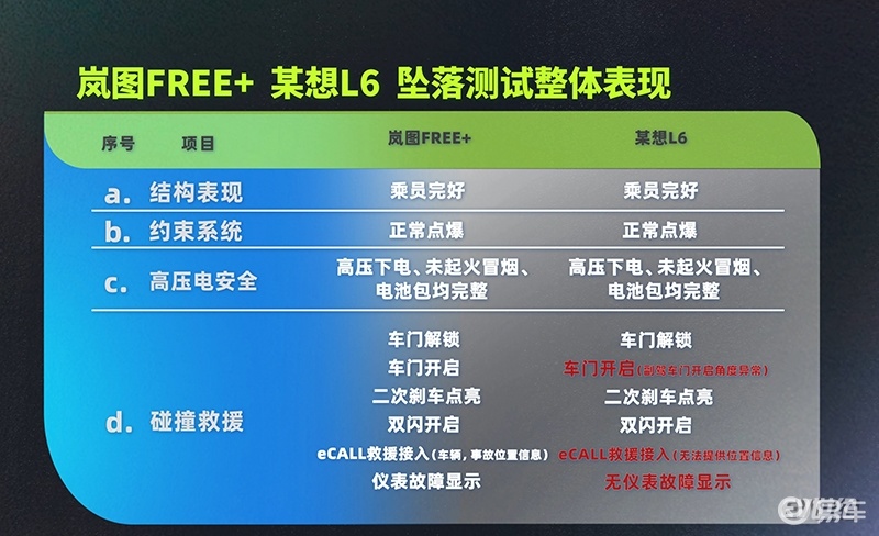 日前,国内知名汽车媒体拉来了全新岚图FREE+以及某想L6,进行了一系列硬核主被动安全测试。尤其是最后部分的15米正向和20米车尾垂直高处跌落测试,超国标3倍测试标准,不仅看上去紧张刺激,反映出来的安全设计,也非常值得仔细推敲。
