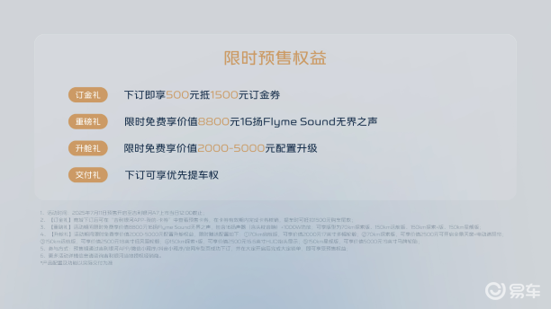 预售期间,用户还能享受多项权益:下订可享500抵1500元订金券,70km探索版及以上车型限时免费升级价值8800元的16扬Flyme Sound无界之声音响,不同版本还能免费升级17英寸轮毂、全景天窗电动遮阳帘、HUD抬头显示等配置(价值2000-5000元),且支持通过吉利银河APP、微信小程序等多渠道下订。