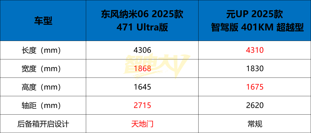 今天小弟就从年轻人买车比较关注的几个维度,来比较一下这两款车。为了让本次对比更有针对性和公平性,分别选择了东风纳米06 471 Ultra版(终端价格10.99万 以下简称东风纳米06)和比亚迪元UP 智驾版 401KM 超越型( 终端优惠价10.98万 以下简称元UP),看看到底谁更值得购买。