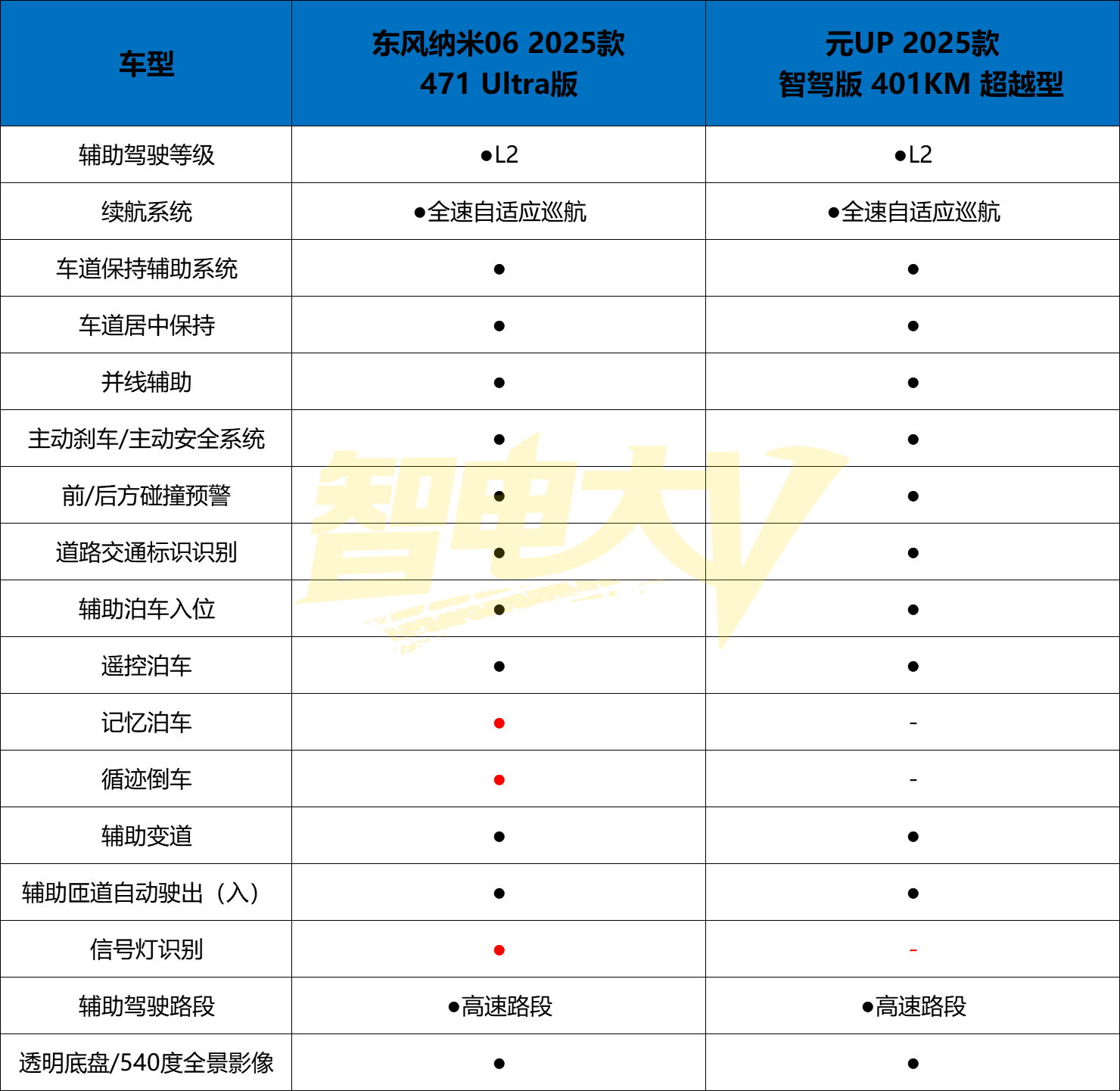 元UP是搭载了比亚迪的天神之眼C辅助驾驶系统,功能上支持高快领航辅助以及泊车功能,比起东风纳米06少了记忆泊车、循迹倒车、信号灯识别等功能,面对日常的使用场景,体验感要逊色不少。