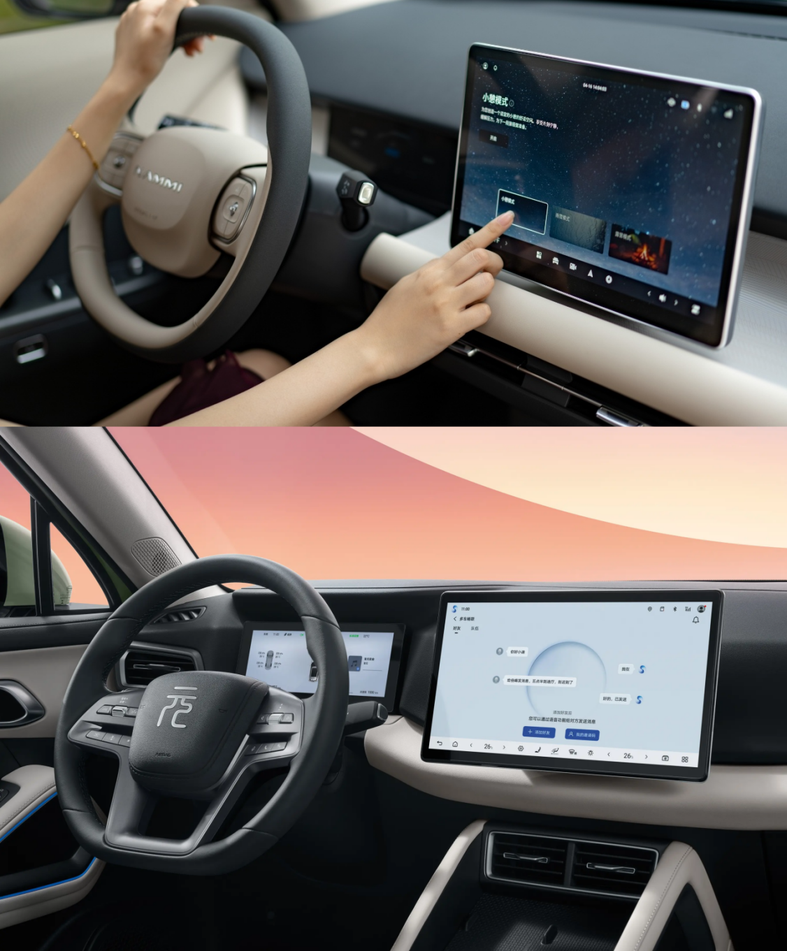 东风纳米06和元UP都采用了环抱式座舱设计,走的是家用简约风格,悬浮式中控屏的尺寸也都一样,所以观感上会差不多。
