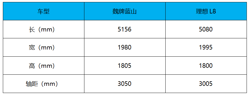 理想L8拥有5080/1995/1800mm的长宽高与3005mm的轴距,而魏牌蓝山的长宽高则来到了5156/1980/1805mm,轴距为3050mm,整体实际上会略修长一些,同时,无论是后备厢基础容积,还是扩展后容积,349-1150L的魏牌蓝山都要略大一些,而理想L8则为313-1098L。