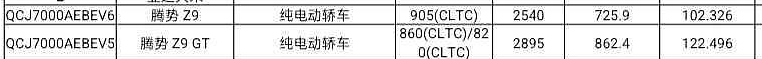 新款腾势Z9此次申报的是单电机版,搭载370kW电机,匹配102.326kWh电池,续航里程为905km,另外还提供122.496kWh电池,续航里程为1068km、1030km。新款腾势Z9 GT匹配122.496kWh电池,续航里程为860km、820km、1036km、1002km;匹配102.326kWh电池,续航里程为880km。
