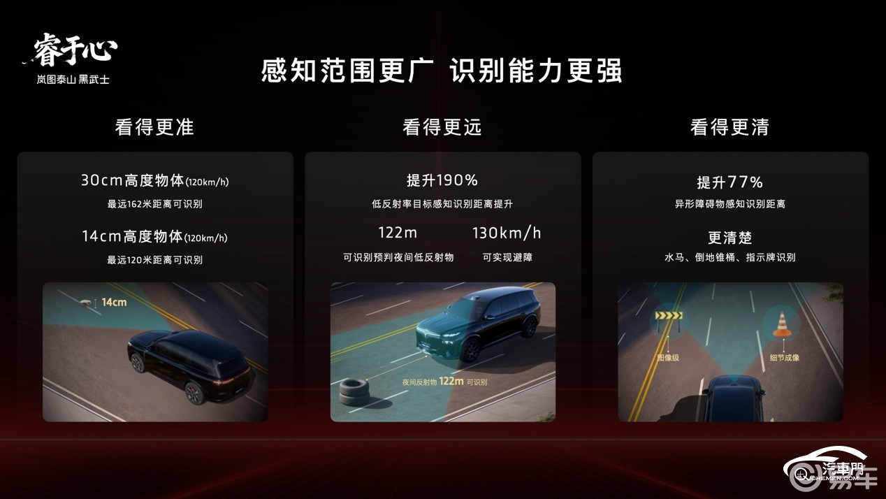 这套多传感器融合的感知体系,为车辆搭建起了全场景、无死角的顶配感知网络与传统。与192线产品相比,新车实现了断层式领先。针对30厘米高度的障碍物,最远识别距离高达162米。即使是14厘米的小目标,也能实现120米的远距精准识别。岚图真正实现了从点云级到图像级的跨越,树立了行业感知硬件的天花板。在央视的权威实测镜头下,这套感知天花板大显神威。面对前车掉落障碍物、异物遮挡视线、驾驶员失能等极其刁钻的突发危机场景,岚图泰山均能在第一时间做出最精准的避险决策,完美化解危机。