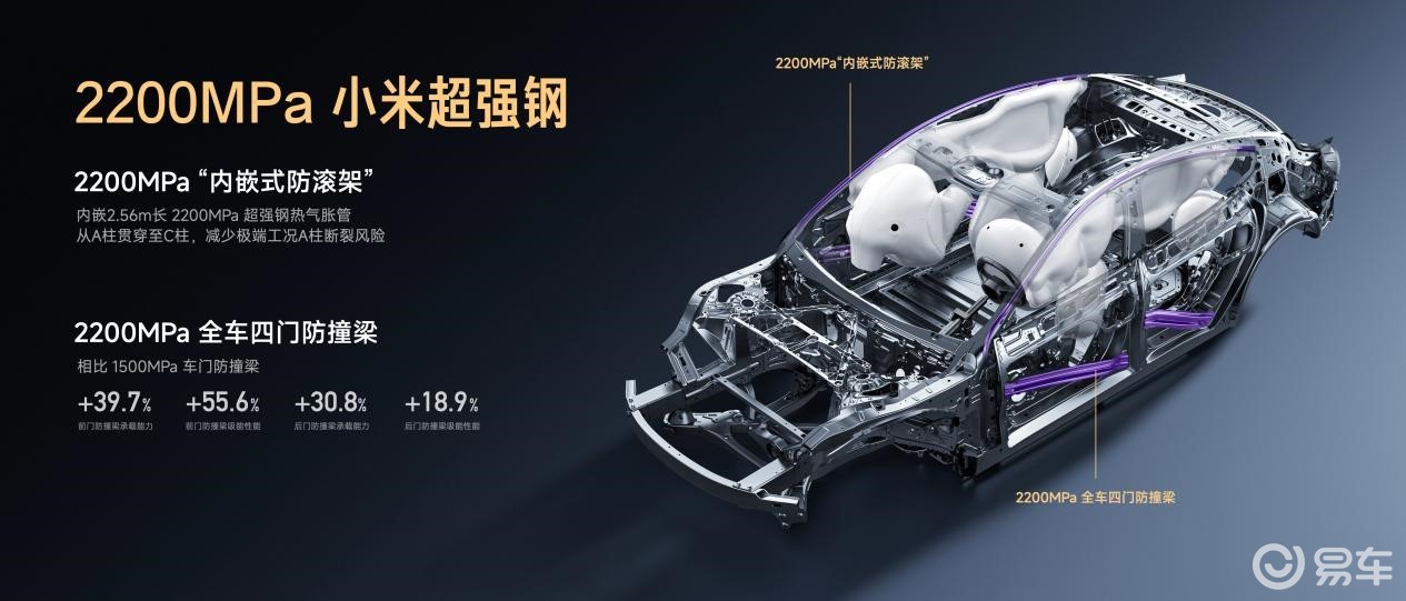 安全层面,新一代SU7以超越行业标准的配置,筑牢全场景安全屏障。整车延续C-NCAP五星、C-IASI G+标准,全系标配2200MPa小米超强钢,高强度钢与铝合金占比达90.3%,车身扭转刚度51000N-m/deg。电池包实现全方位防护,标配1500MPa防刮底横梁与防弹涂层,热失控防护远超新国标,55℃满电状态下单电芯热失控不扩散、不起火、不爆炸,还配备ASIL-D等级电池系统,4ms紧急断电+24小时车云协同预警,守护电池安全。