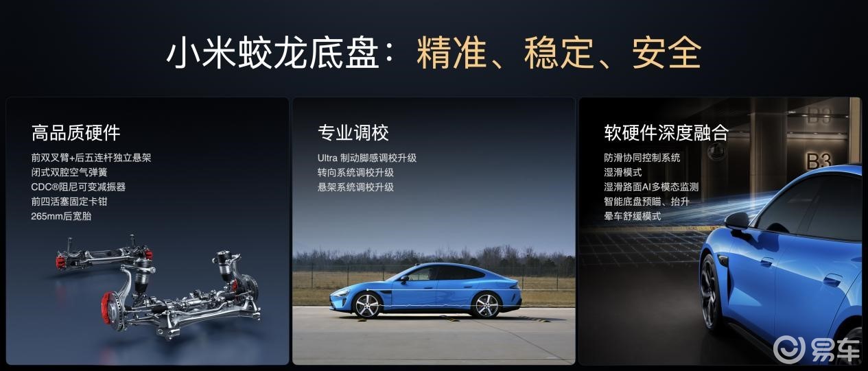 小米蛟龙底盘则实现硬件、软件、智能全维度跃升,全系标配前双叉臂+后五连杆独立悬架,Pro版和Max版配备闭式双腔空气弹簧与CDC阻尼可变减振器,悬架高度50mm可调,支持三种硬度模式,兼顾运动与舒适。转向比优化至12.5:1,11.4米转弯直径实现灵活操控,全系标配前四活塞固定卡钳与265mm后宽胎,制动性能与抓地性大幅提升。同时,底盘搭载湿滑路面AI多模态检测、自研协同防滑控制系统,车轮打滑量降低40%,还配备晕车舒缓模式,让驾控既精准又舒适。