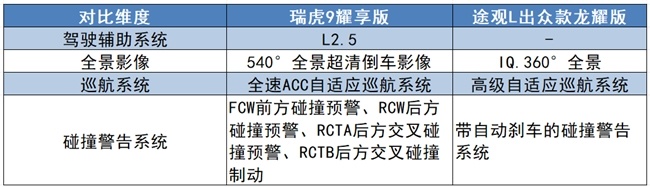 途观L两驱龙耀版虽然也具备基本的安全配置,如车身稳定系统、安全气囊等,但在车身高强度钢占比和气囊数量上,与瑞虎9耀享版存在一定差距。而且它的驾驶辅助系统仅配备高速自适应巡航、碰撞警告系统等基础功能。高阶智驾功能的缺失,使得它在面对复杂路况时的安全辅助能力相对有限。