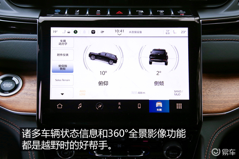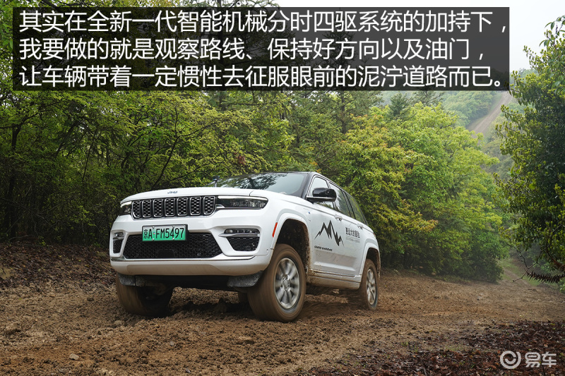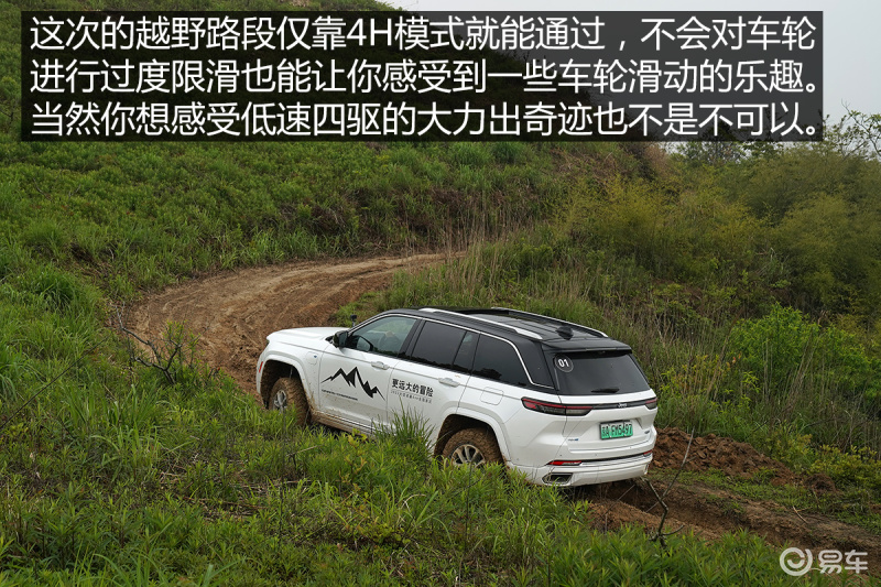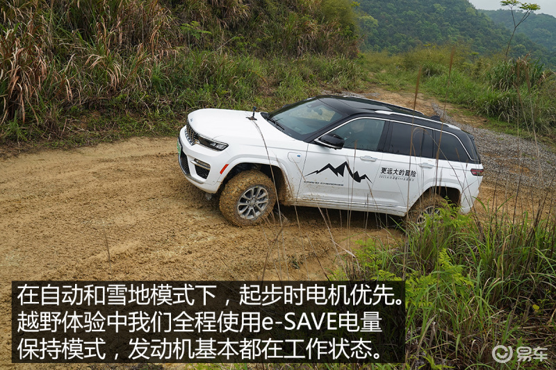 在自动模式下依靠电机动力来起步,是有着不需要太大动力的考量,当然我认为大切诺基4xe的电机动力输出也不小了。在越野能力最强的ROCK岩石模式下,发动机无疑是全程伺服的。另外鉴于大切诺基4xe是一台插电混动车型,所以还有混动、纯电以及电量保持三种电量管理模式,考虑到一整天的试驾活动,教练建议我们使用电量保持模式,相比前两种,电量保持模式下发动机的参与频率会更高一些。