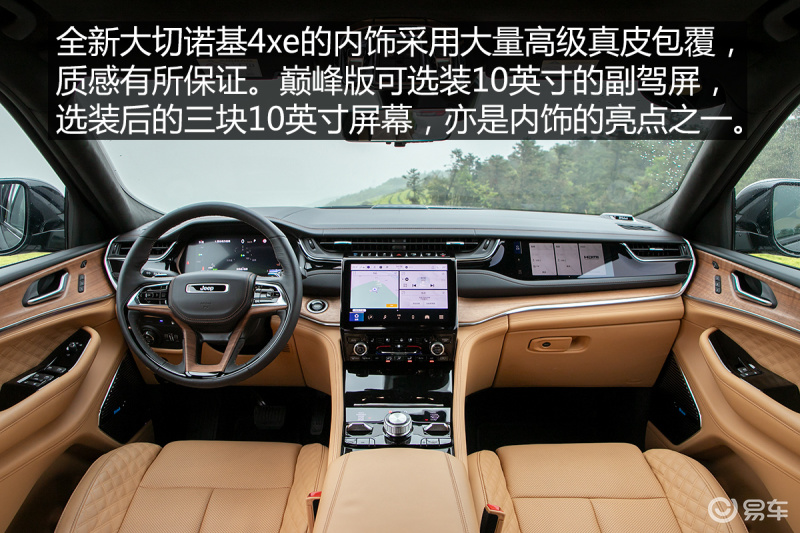 全新大切诺基4xe的车内还是不折不扣的美式风格,全新的设计语言在粗犷的线条下透露着属于这个时代的精致,内饰大量采用高级真皮包覆,质感也有保证。当然内饰最大的看点还是三块10英寸的屏幕,对,全液晶仪表、中控屏和副驾屏的尺寸均为10英寸,不过10英寸的副驾屏是需要选装的。