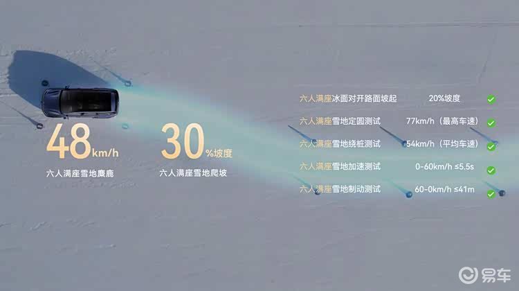 在雪地麋鹿测试中,华境S以六座满员状态跑出48km/h优异成绩,展现出强大的冰雪路面操控稳定性,全场景出行都从容。