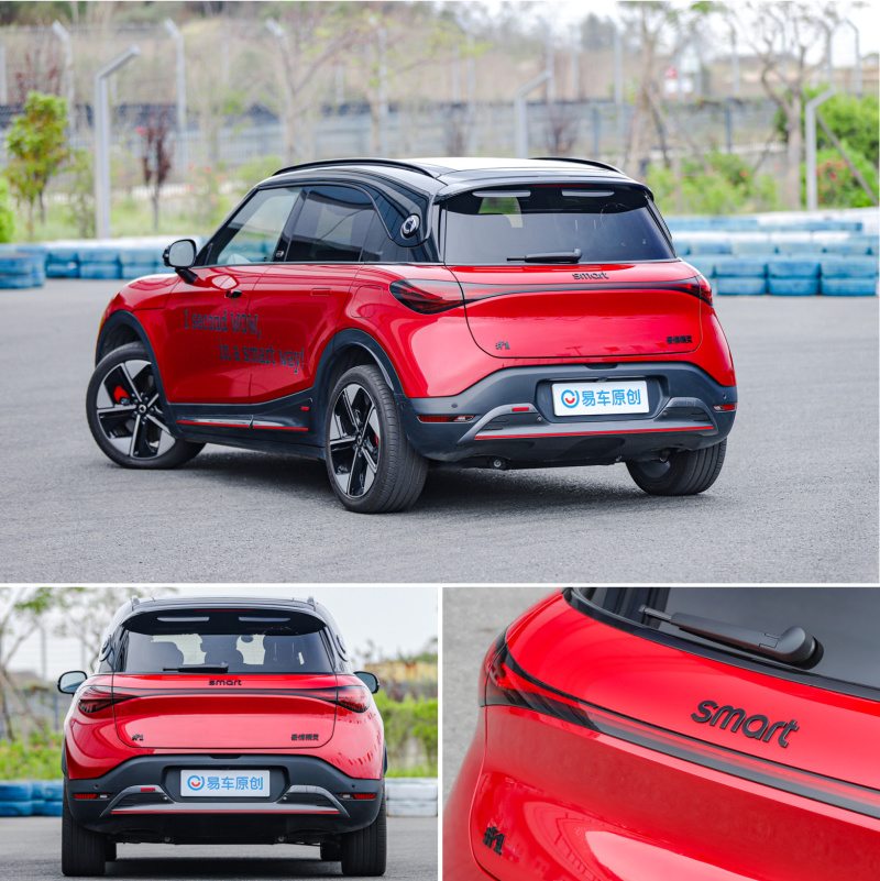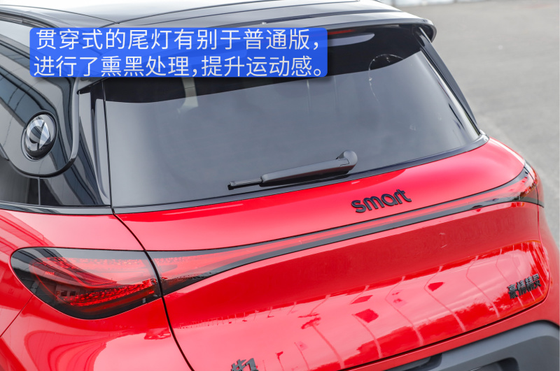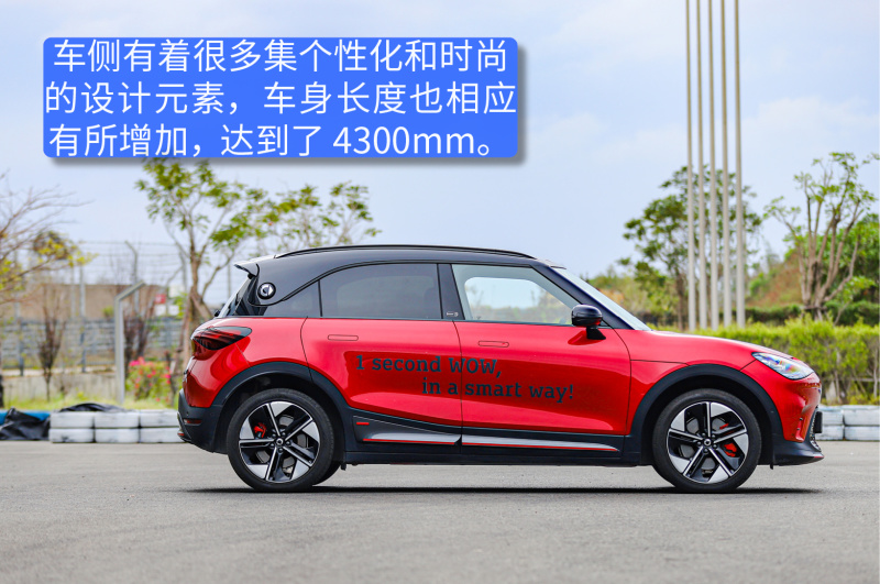 来到侧面,该车有着很多集个性化和时尚的设计元素,红黑的双色车身、隐藏式车门把手、无框车窗,以及D柱的发光smart徽标。车身尺寸方面,由于前后保险杠的造型变化,车身长度也相应有所增加,达到了4300mm,其余车身参数则没有发生变化。