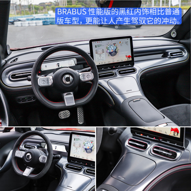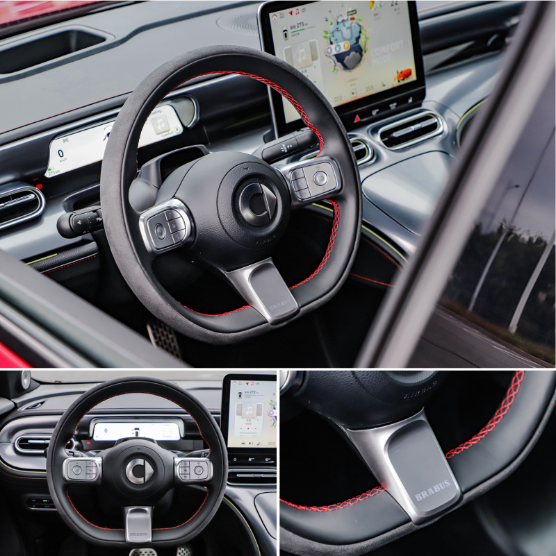 BRABUS性能版的方向盘采用Alcantara材质包裹,加以红色缝线点缀,整体握感非常不错。方向盘上的发光徽标也由普通版的“smart”字样改成了“BRABUS”。