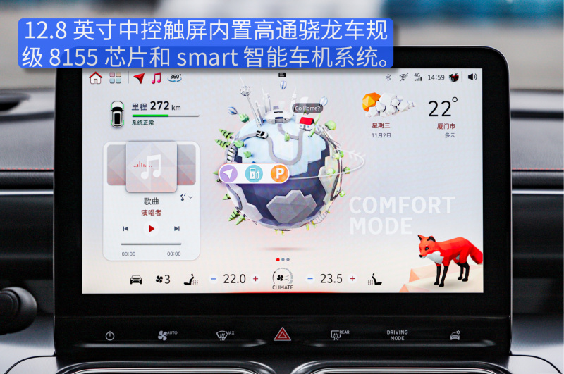 9.2英寸的全液晶仪表盘内嵌在仪表台之中,仪表的UI设计相当简单明了,各种信息一目了然。中控屏的尺寸达到了12.8英寸,内置高通骁龙车规级8155芯片和smart智能车机系统。