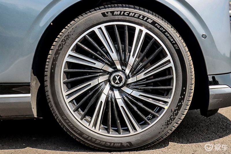 轮胎部分,实测车型配备的是米其林的PS EV系列,尺寸为255/45 R21,这是一款专门为电动车打造的产品,在胎面中央采用了一种硬质复合材料,从而提供了应对电动跑车高扭矩特性所需的抓地力,并且对提升续航有一定的帮助,这款产品几乎是现在中高端纯电动车型的标配。