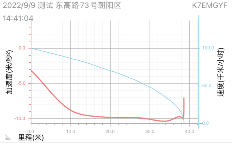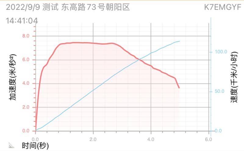 起步阶段电动机瞬时的扭矩释放,昂首向前车身姿态气势上非常足,有点“站起来跑”的感觉,车轮并没有任何打滑,车辆最大的加速度超过了7m/s²一直维持到了75km/h左右,随后开始衰减。