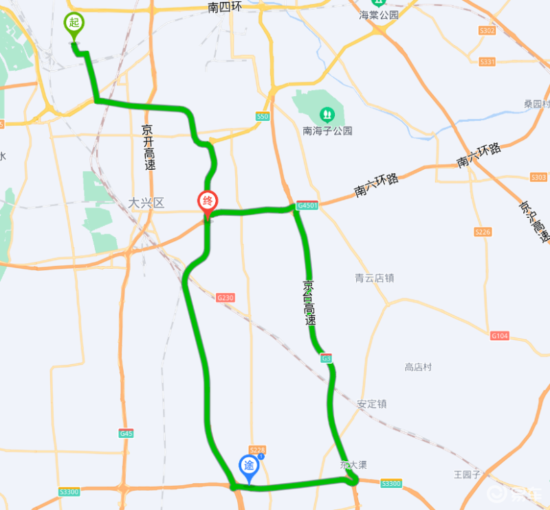 续航测试部分,为了给大家更真实的参考,我们全程以高速为主,从北京世界公园满电出发,途经南五环,走大兴机场高速、大兴机场北线高速、京开高速、六环路绕圈,六环路段限速100km/h,其余均为120km/h。