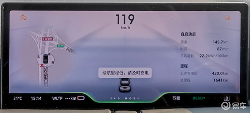 行驶至420km时车辆已经无法显示续航里程,并发出了低电量提醒,但并没有限制动力,为了保证行驶安全,随后我们进入礼贤服务区在停车场绕行,最终行驶了461.3km,车辆失去动力。