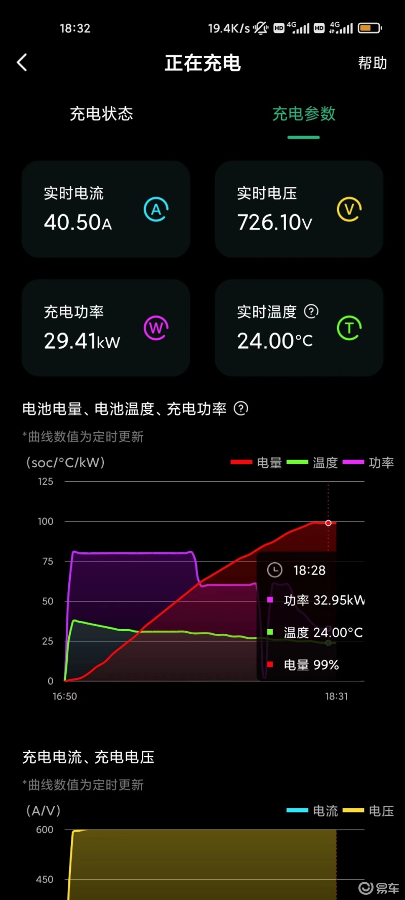 实际充电过程中前段基本维持在80kW,随着充电车辆增多,功率分流,下降至了60Kw左右,在充电量接近95%时功率下降至41kW左右,接近满电时最后的充电功率在30kW附近。虽然没有匹配到足够功率的充电桩,其实800V高压平台还是发挥出了一定实力,充电初始阶段功率上升非常快,最后的涓流充电功率下降相对也要慢一些。