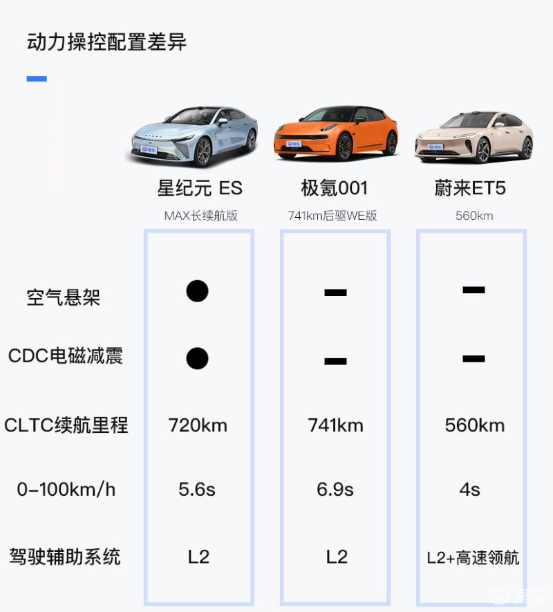 续航里程方面,星纪元 ES MAX长续航版和入门版的极氪001都是700km+,蔚来ET5只有560km。动力上,单电机的星纪元 ES MAX长续航版0-100km/h加速成绩5.6s,好于极氪001入门版,比蔚来ET5入门版是双电机要慢一些,但也很快了。底盘方面,星纪元 ES的那些同级天花板配置在另两台车上也都是没有的。三款车目前都是L2级别的驾驶辅助,当然,星纪元 ES MAX长续航版需要选装包才能实现高速匝道的上下功能,和极氪001相同,蔚来ET5则是全系标配了高速领航辅助。