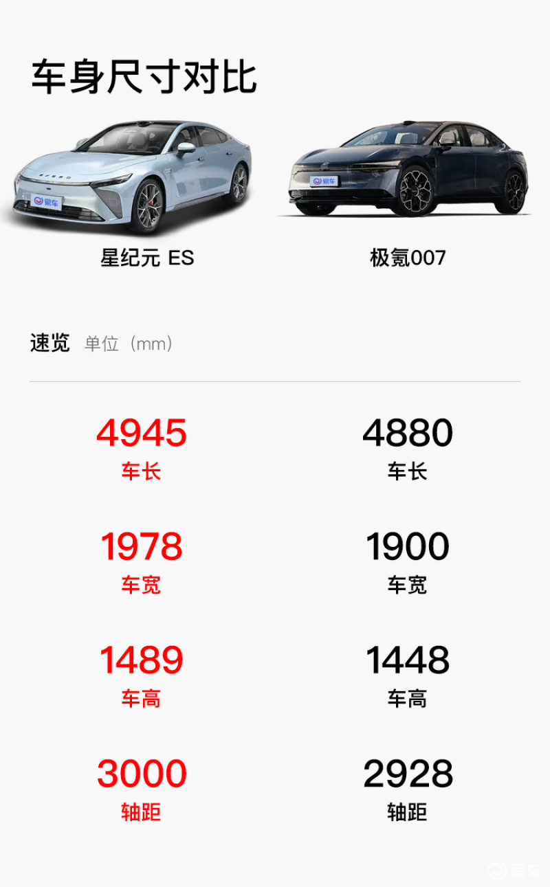 由于极氪007属于中型车的定位,相比星纪元 ES,它的体量感和数据上都要小一圈,看上去也不如星纪元 ES大气,花一样的钱,车身尺寸和车内空间则是星纪元 ES占优。