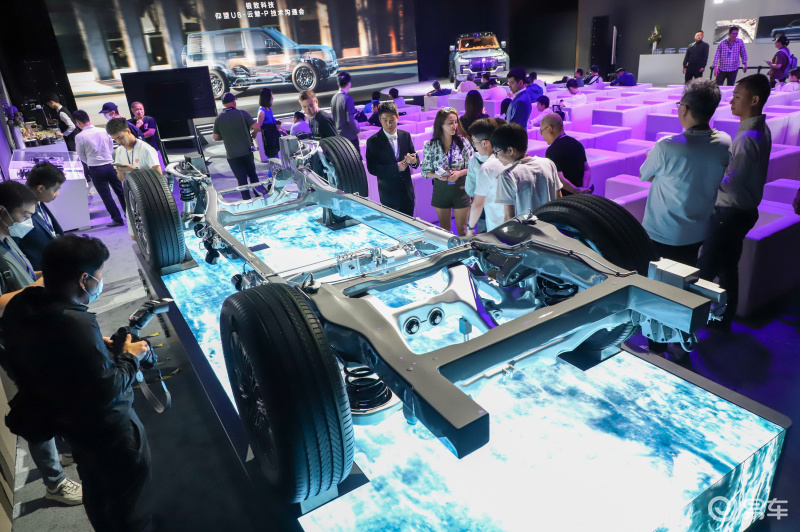 最后我们来关注一些安全方面的设计,我借用之前仰望U8上的底盘给大家介绍一下,豹5整个大梁车架的高强度钢占比达到98%,轴荷比为50:50。