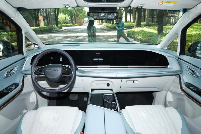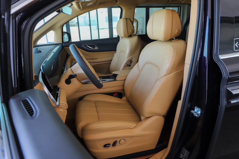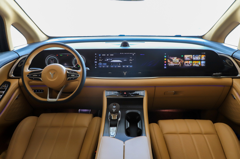 内饰设计方面,大家MIFA9最大的特色就是贯穿式的中控三联屏,几乎没有物理按键,对于科技感的提升是显而易见的。而且前排也没有太浓的商务气息,反而是一种很家用的氛围,这种居家和科技并存的感觉,的确在大家MIFA9上得到了很好的体现。同时作为一辆售价超过40万元的MPV,大家MIFA9在用料层面也达到旗舰车型应有的水准,整个座舱大量采用牛皮材质包覆,高级感呼之欲出。