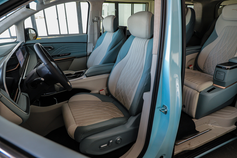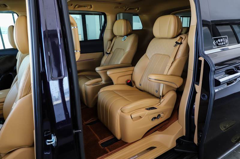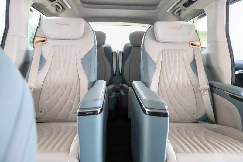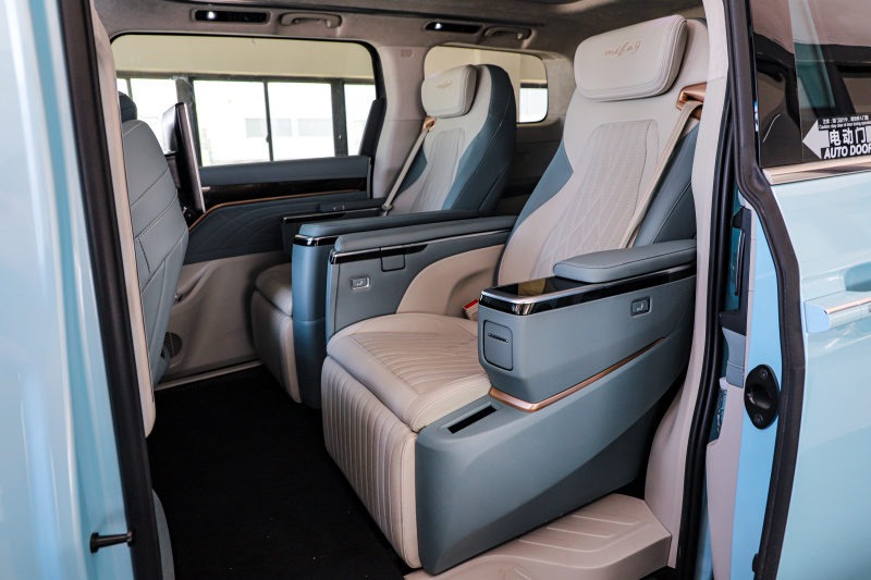 大家MIFA9的座椅采用了双色设计,足够宽大而且填充物厚实,整体的乘坐舒适性非常棒。而且前排座椅还支持加热/通风/按摩功能,配置齐全。二排座椅也采用了两张独立座椅,电动调节、座椅加热/通风/按摩、腿托、电动头枕以及小桌板这些功能一应俱全,堪称头等舱般的享受。另外第三排座椅也是大家MIFA9相比其他MPV车型的优势所在,大家MIFA9在第三排也采用了两个独立座椅,不仅拥有电动调节还带有腿托,并且支持座椅加热/通风功能,还配备了1米长的电动滑轨,此外第三排座椅还拥有两个Type-C接口,能带来极高的舒适性和舒适性。大家MIFA9还配备了超长B柱上车扶手,方便老人小孩上下车。