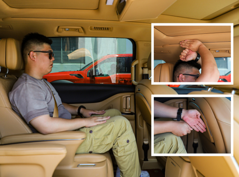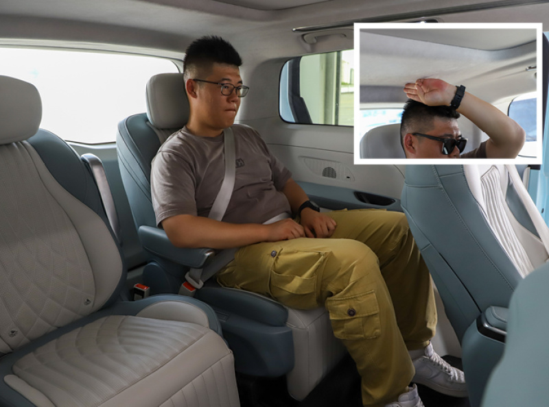先来看看大家MIFA9的内部乘坐空间吧,身高183cm的体验者坐在第一排,头部空间超过两拳。来到第二排,头部空间为一拳四指,腿部空间则超过两拳,当然第二排座椅其实是可以移动的,我们调节的标准是保障第三排乘客也能拥有充足的空间。体验者来到第三排,腿部还有充足的空间,头部还剩三指左右。