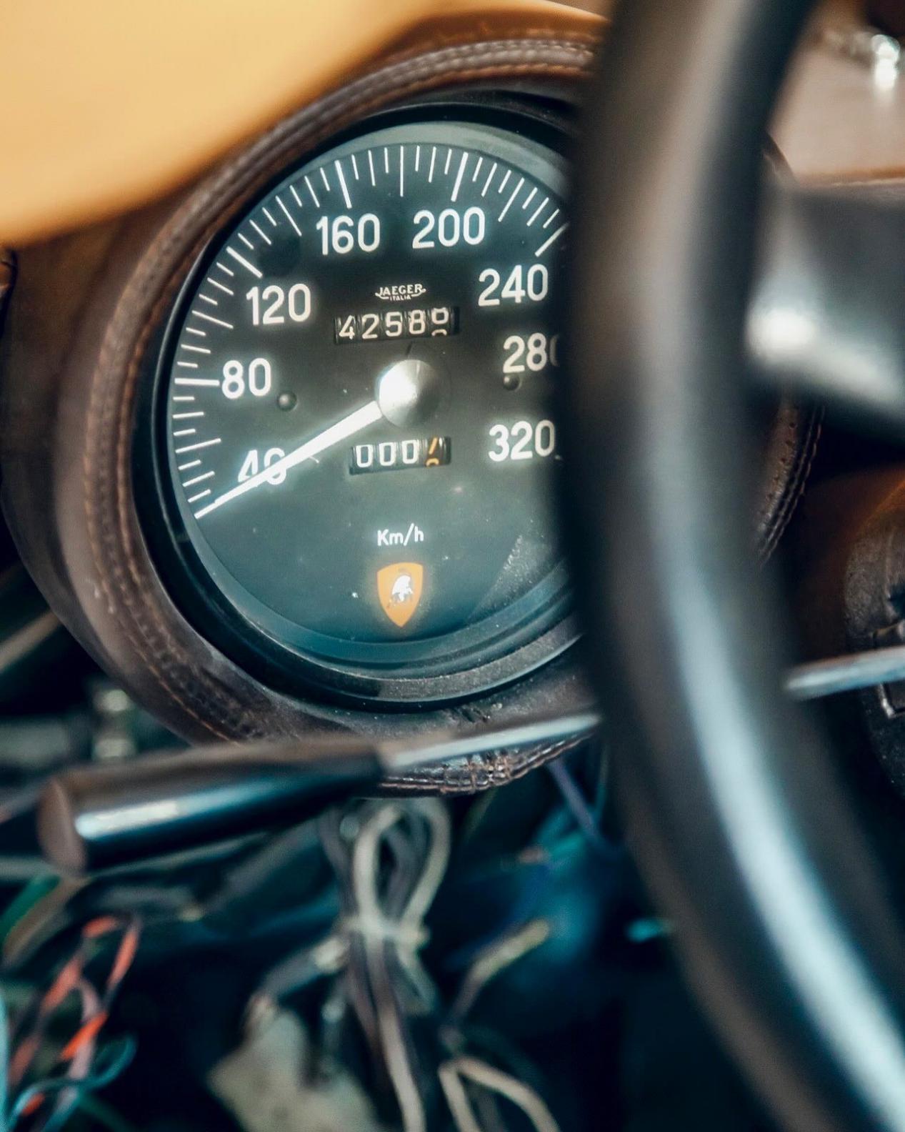 车内里程表显示这辆 Miura仅行42588公里,对于一款车龄超过50年的超级跑车来说,这样的行驶里程是相当可观的,而且内饰的部件似乎也保存得相当完好。