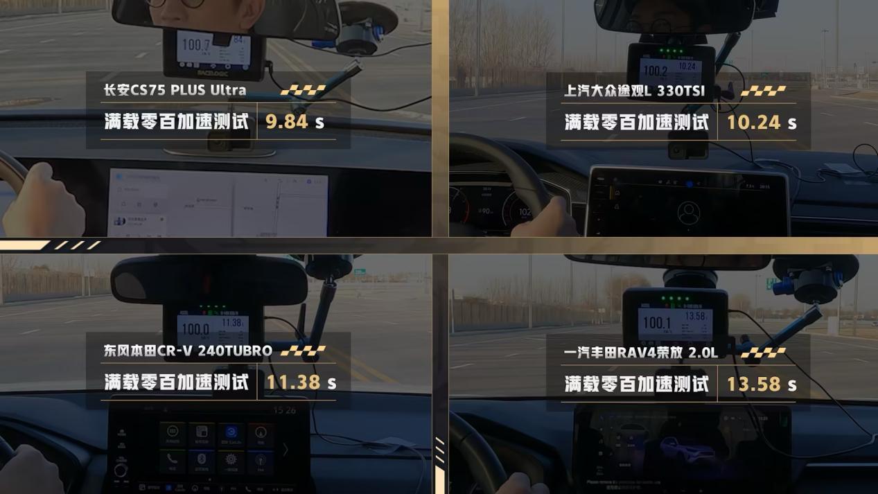 满载零百加速是动力评测中的重头戏,直接影响驾驶者日常驾驶的起步反应。在这项测试中,长安第四代CS75 PLUS Ultra的表现非常亮眼。虽然上汽大众途观L和东风本田CR-V的加速表现也不错,但长安第四代CS75 PLUS Ultra的加速反应更加迅捷,起步时动力系统表现尤为敏捷,几乎没有拖沓感。相比之下,一汽丰田RAV4荣放2.0L的加速能力则显得稍温和,起步加速相较长安第四代CS75 PLUS Ultra有一定差距。